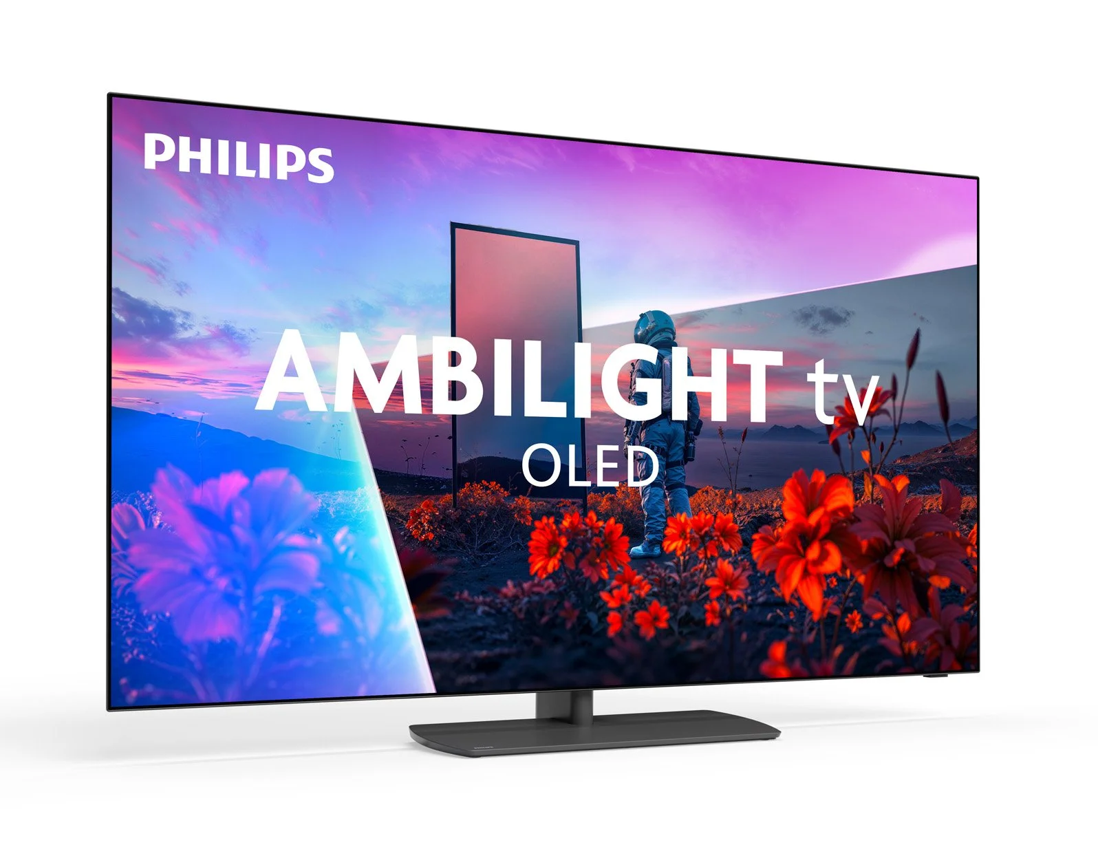 OLED811 - Available in 42”,48”, 55”, 65”, and 77’ screens sizes and features 10th Gen P5 AI processing, new higher-output OLED_EX panels, three-sided Ambilight and Dolby Vision 2 MAX compatibility.